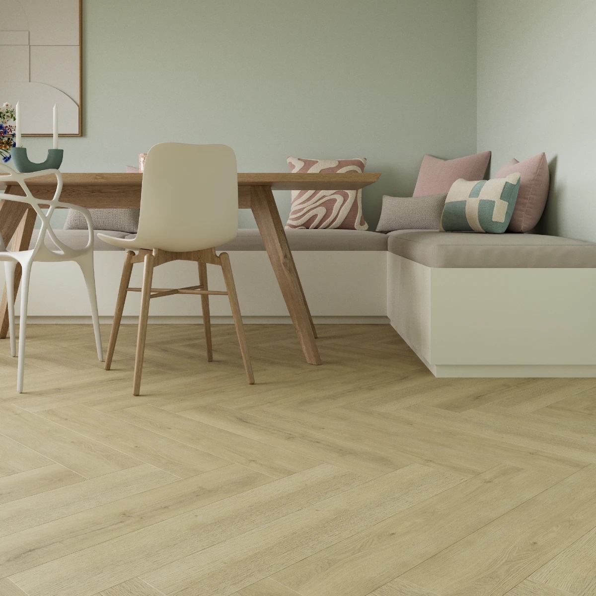 De Mandal visgraatvloer uit de Saffier Allee-collectie ademt een sfeer van tijdloze elegantie met een moderne touch. Het klassieke visgraatpatroon, uitgevoerd in planken van 153 × 765 mm, zorgt voor een dynamische en verfijnde uitstraling die elke ruimte onmiddellijk cachet geeft. De diepe embossing en matte afwerking geven deze PVC vloer een authentieke houtlook en -textuur, die nauwelijks van echt hout is te onderscheiden. Mandal visgraat is perfect voor wie een luxe gevoel wil creëren met de praktische voordelen van een kwaliteitsvloer tegen een toegankelijke prijs.